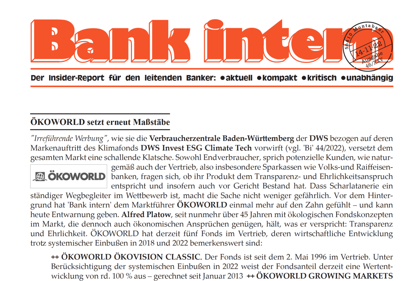 „Irreführende Werbung", wie sie die Verbraucherzentrale Baden-Württemberg der DWS bezogen auf deren Markenauftritt des Klimafonds DWS Invest ESG Climate Tech vorwirft (vgl. 'Bi' 44/2022), versetzt dem gesamten Markt eine schallende Klatsche. Sowohl Endverbraucher, sprich potenzielle Kunden, als naturgemäß auch der Vertrieb, also insbesondere Sparkassen wie Volks-und Raiffeisenbanken, fragen sich, ob ihr Produkt dem Transparenz- und Ehrlichkeitsanspruch entspricht und insofern auch vor Gericht Bestand hat. Dass Scharlatanerie ein ständiger Wegbegleiter im Wettbewerb ist, macht die Sache nicht weniger gefährlich. Vor dem Hintergrund hat 'Bank intern' dem Marktführer ÖKOWORLD einmal mehr auf den Zahn gefühlt – und kann heute Entwarnung geben. Alfred Platow, seit nunmehr über 45 Jahren mit ökologischen Fondskonzepten im Markt, die dennoch auch ökonomischen Ansprüchen genügen, hält, was er verspricht: Transparenz und Ehrlichkeit. Die ÖKOWORLD hat derzeit fünf Fonds im Vertrieb, deren wirtschaftliche Entwicklung trotz systemischer Einbußen in 2018 und 2022 bemerkenswert sind.