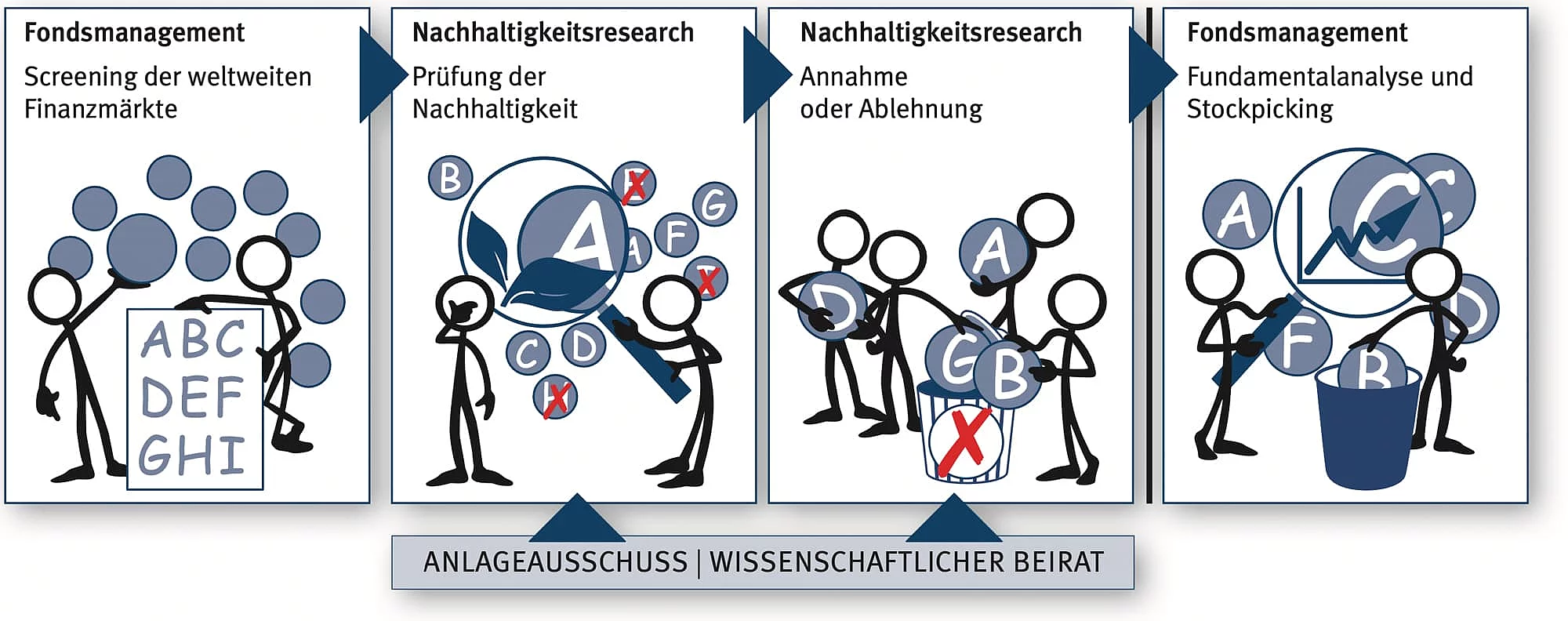 Unser Investment-Prozess sieht eine vollständige Trennung von Nachhaltigkeitsresearch einerseits und Portfoliomanagement andererseits vor. Unsere Portfoliomanager können ausschließlich in Unternehmen investieren, die nach Überprüfung der sozialen, ethischen und ökologischen Kriterien durch die hausinterne Abteilung Nachhaltigkeitsresearch in das jeweilig passende Anlageuniversum eines Fonds aufgenommen wurden. Auf der Grundlage eines fundamentalen Bottom-Up Ansatzes treffen dann die Portfoliomanager in Zusammenarbeit mit den Finanzanalysten in den jeweiligen Anlageuniversen eine taktische bzw. strategische Anlageentscheidung in den Fonds.