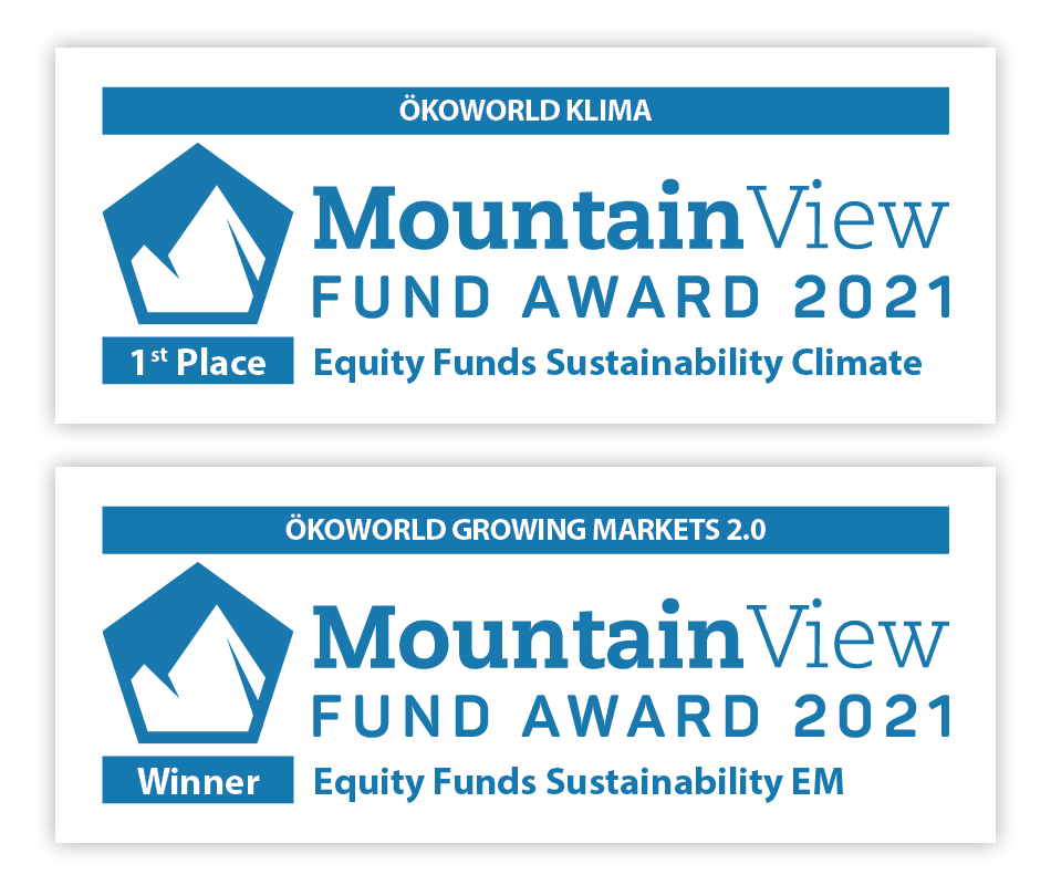 Bei den Mountain View Fund Awards 2021 konnten sich sowohl der ÖKOWORLD KLIMA als auch der ÖKOWROLD GROWING MARKETS 2.0 durchsetzen und gewannen Awards in den Kategorien „Equity Funds Sustainability Emerging Markets“ und „Equity Funds Sustainability Climate“.
