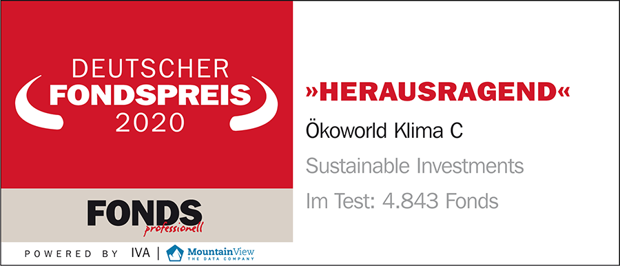 Im Segment „Sustainable Investment“ wird der ÖKOWORLD KLIMA (WKN A0MX8G) als „HERAUSRAGEND“ beurteilt und gewinnt den DEUTSCHEN FONDSPREIS 2020 in Mannheim. Im Rahmen des 19. FONDS professionell KONGRESSES haben die Herausgeber von FONDS professionell am 29. Januar 2020 den DEUTSCHEN FONDSPREIS wieder mit fachlicher Unterstützung des auf Portfolio- und Risikoanalyse spezialisierten Instituts für Vermögensaufbau IVA verliehen. Basis der Auszeichnung ist eine quantitative Auswertung der zehn wichtigsten Fondskategorien. In einem weiteren Schritt wurden die Top-Fonds dann in einem mehrstufigen Verfahren unter die Lupe genommen. Dabei wurde nicht nur analysiert, ob sich der Fonds konsistent innerhalb der Bandbreiten seines Anlageuniversums bewegt hat; sondern auch, ob die erzielten Ergebnisse tatsächlich auf die richtigen Entscheidungen des Managements zurückzuführen sind.